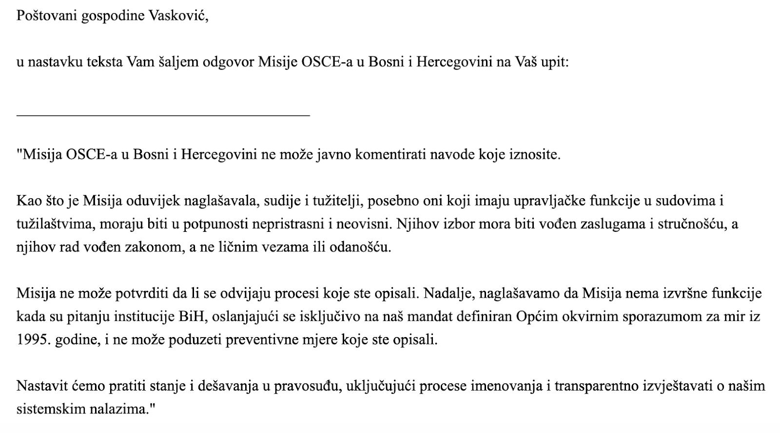"Misija OSCE-a u Bosni i Hercegovini ne može javno komentirati navode koje iznosite.