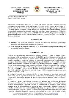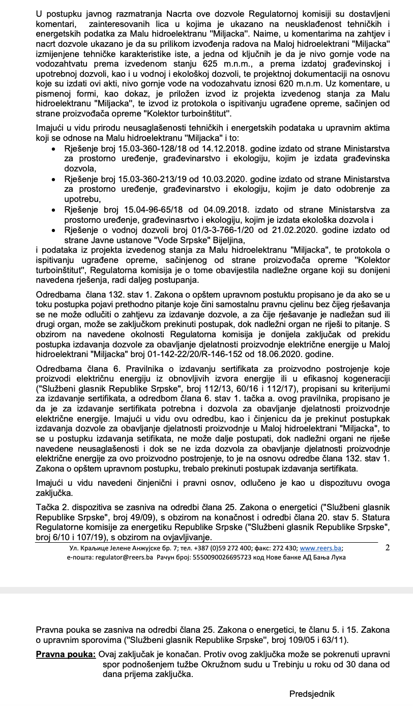 Regulatorna komisija za energetiku Republike Srpske u konačnom zaključku (broj: 01-143/20/R-146-153) prekinula je izdavanje sertifikata za proizvodno postrojenje koje koristi obnovljivi izvor energije za MHE „Miljacka“, koja je u vlasništvu “GREEN ENERGY” d.o.o. Pale.