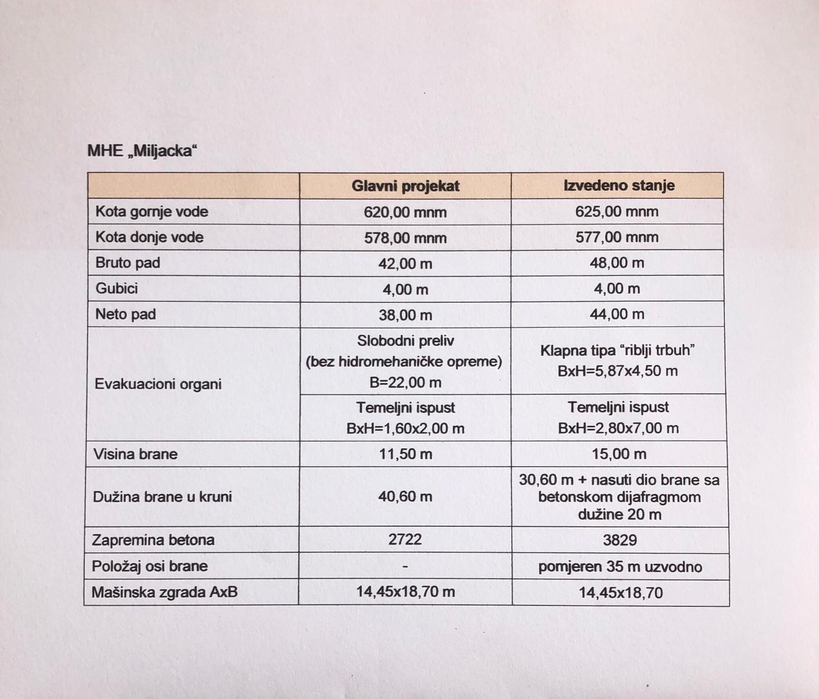 Takođe je konstatovala neusaglašenost tehničkih i energetskih podataka u upravnim aktima, koji se odnose na MHE „Miljacka“.