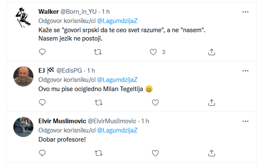 "Me Tarzan, sorry, Milorad, you Jane, sorry, Čita. My English no good but I good. Nemoj nas ovako brukati. Ili pričaj na našem jeziku ili pusti druge da ti pišu na engleskom jer ovako će stranci misliti da smo svi 'glupi Bosanci'", poručio je Lagumdžija.
