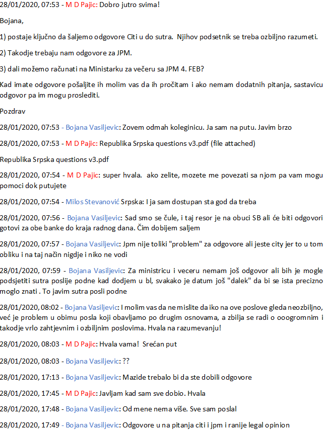 Iz prepiski se vidi da su oba ministarstva prikupljala podatke koje im je Pajić tražio te dogovarali i sastanak sa predstavnicima četiri banke u Banjaluci (Citibank, Societe Generale, JP Morgan i Raiffeisen International) koji je održan početkom februara 2020. godine.