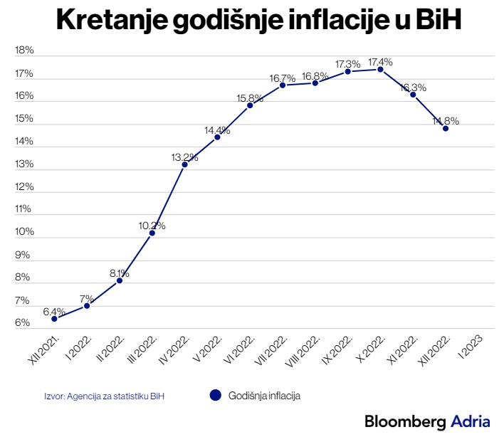 ”Stopa opće inflacije neće tako lako opasti, a temeljna inflacija će nastaviti stvarati pritisak barem tokom prvog polugodišta”, upozorili su analitičari Bloomberg Adrije.