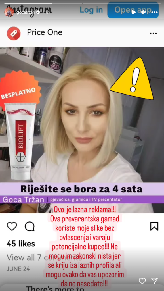 „Ovo je lažna reklama! Ova prevarantska gamad koriste moje slike bez ovlašćenja i varaju potencijalne kupce. Ne mogu im zakonski ništa, jer se kriju iza lažnih profila, ali mogu ovako da vas upozorim da ne nasedate!“, napisala je Goca Tržan na svom Instagram profilu.