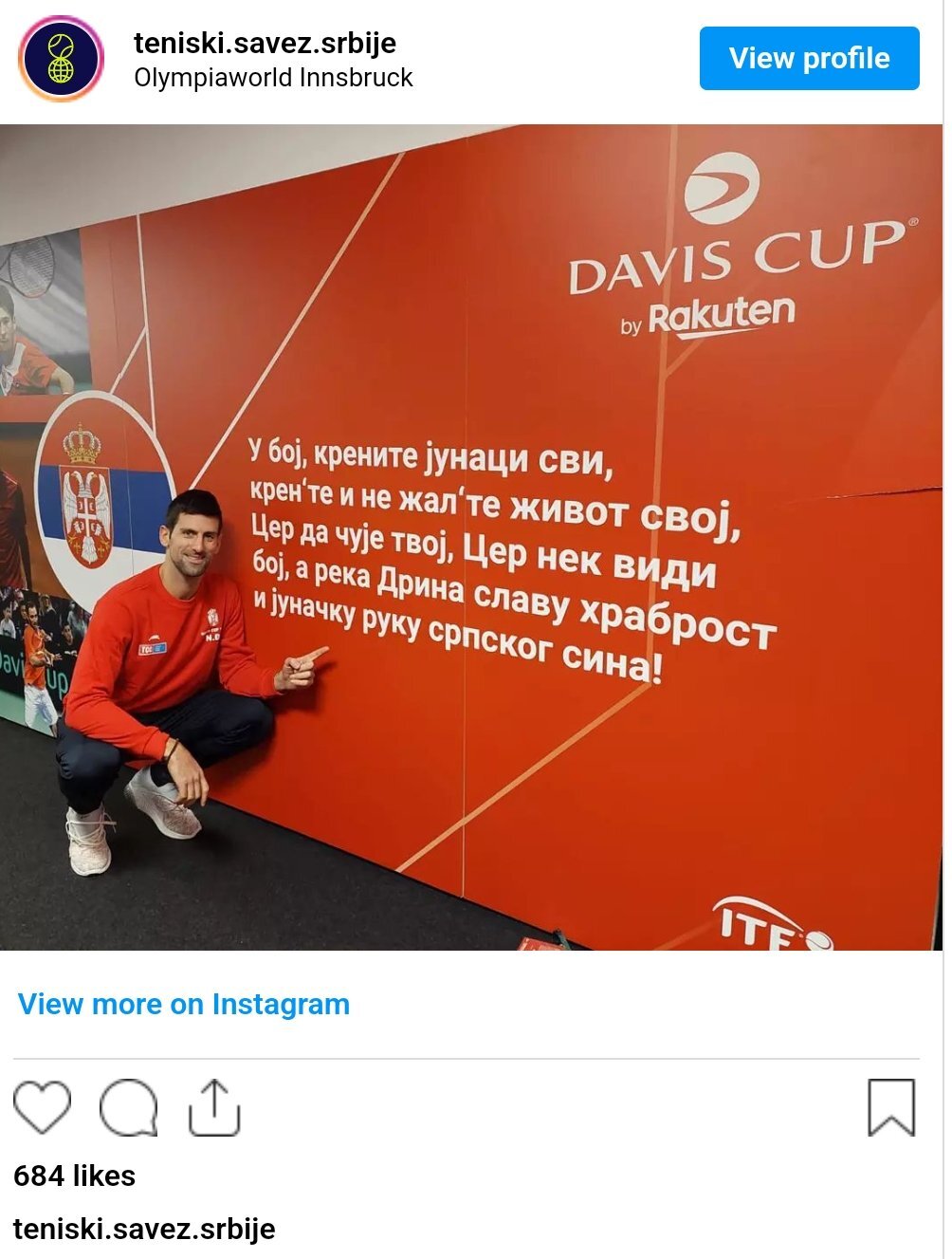 Nakon što je zajedno s fanovima u Srbiji proslavio još jednu svoju pobjedu uz zvuke koračnica i pjesama koje pozivaju na rat, Teniski savez Srbije objavio je fotografiju Đokovića uz još jedan neprimjereni sadržaj.