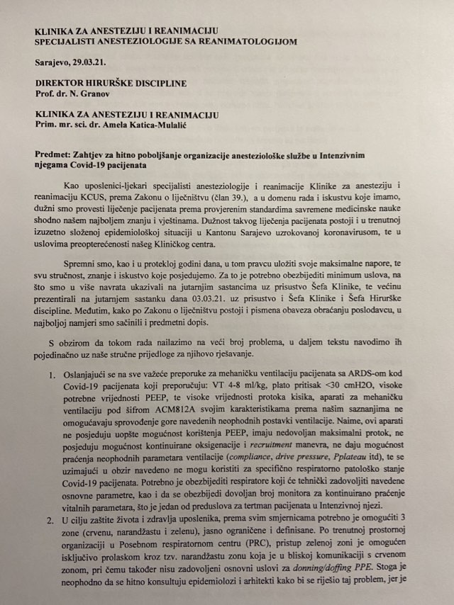 Dio pisma anesteziologa KCUS-a iz marta 2021.