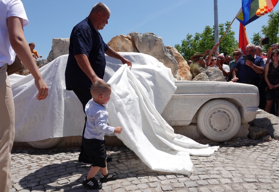 Ivan Topić Nota idejni začetnik spomenika, dijete gastarbajtera, koji je i sam okusio njemački hljeb, podigao je u naručje svojeg dvogodišnjeg unuka Juru Kordića i onda su zajedno potegnuli bijeli plašt. Ispod njega izniknu kameni ljepotan mercedes 115. minika simbol imotskih gastarbajtera, piše Radio Imotski.