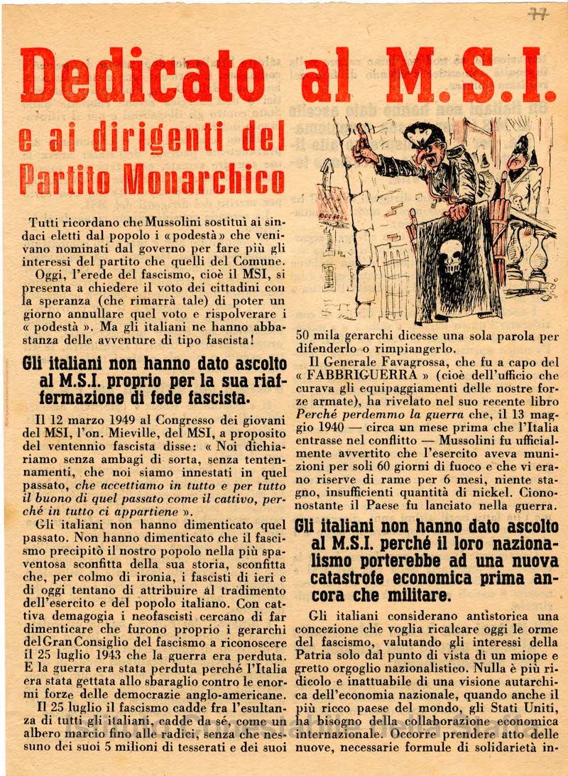 Tokom svog postojanja – 1946.-95. – MSI je koristio emocionalno nabijen pojam 'sjećanja' kako bi fašističku prošlost održao živom u antifašističkoj republici. Jezik mučeništva bio je centralni dio ove strategije. Tokom Olovnih godina, čelnik MSI-ja Giorgio Almirante odao je počast mrtvim krajnjim desničarima kao 'mučenicima' koji su žrtvovali svoje živote u ime stranke, predstavljajući ih kao manjinu koju progoni dominantna sila. Ovaj narativ žrtve danas održava neofašistički angažman.