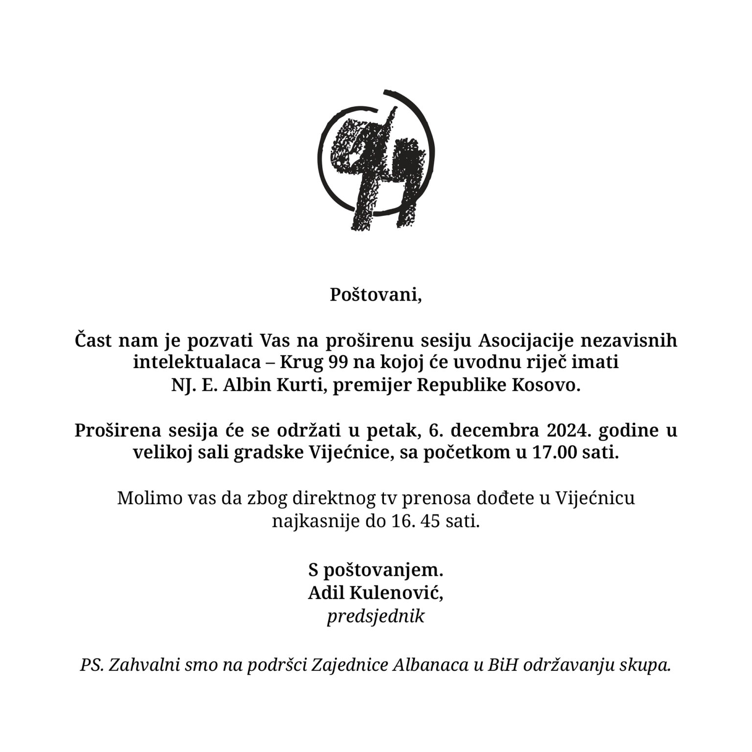 Predsjednik Kruga 99 Adil Kulenović u srijedu je uputio poziv zvanicama i zainteresovanima da dođu na proširenu sesiju te nevladine organizacije, na kojoj će uvodnu riječ imati premijer Republike Kosovo.