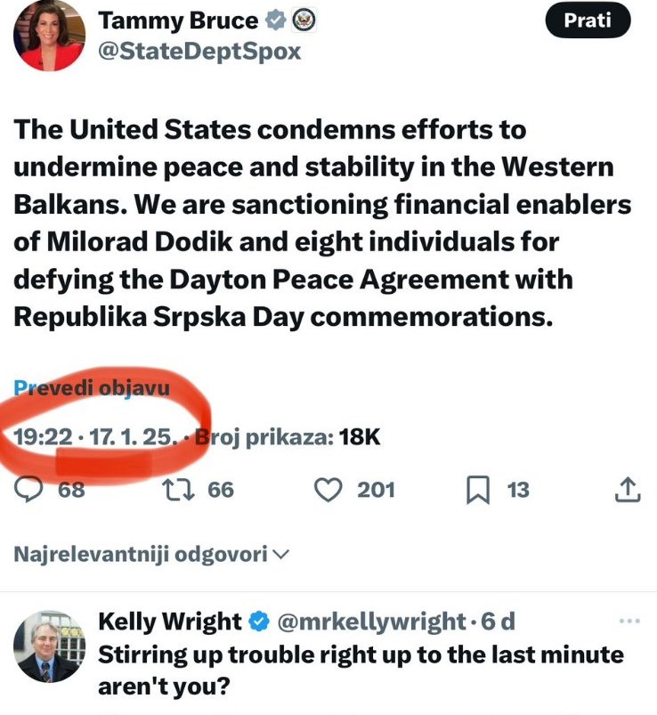 Naime, nova portparolka State Departmenta Tammy Bruce samo je preuzela zvanični nalog na kojem su ostale i sve objave prethodne administracije, što su brzo uočili i zvaničnici iz Republike Srpske koji su poručili da Konaković obmanjuje javnost.
