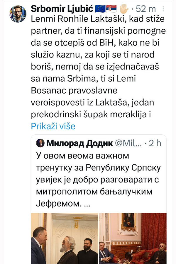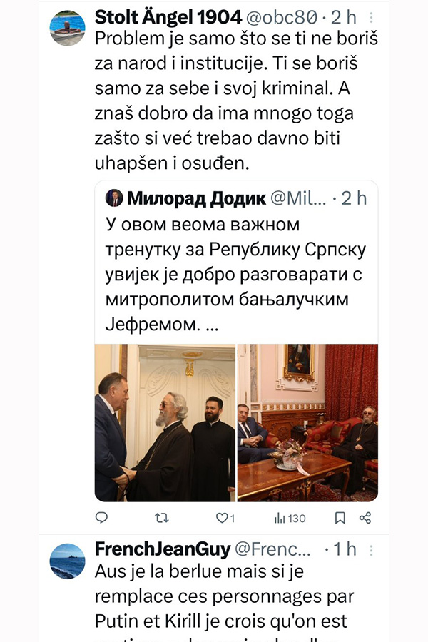 Ne stišavaju se reakcije na društvenim mrežama nakon sastanka Milorada Dodika, predsjednika bh. entiteta Republika Srpska s vladikom Jefremom u Banjoj Luci.