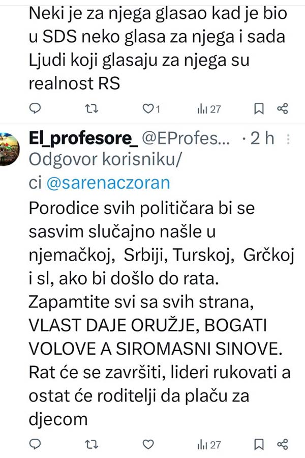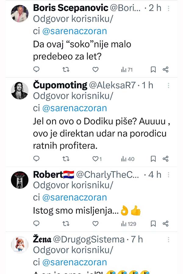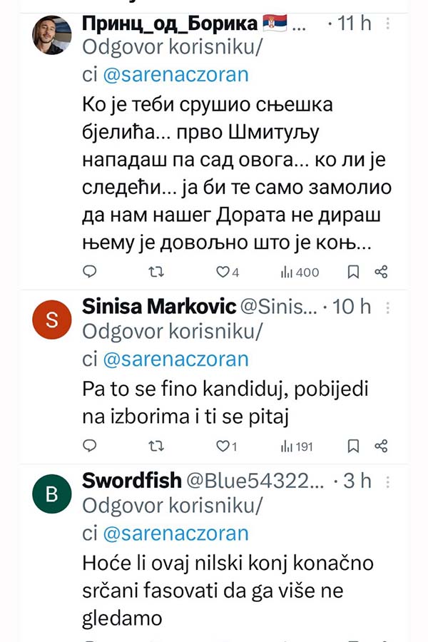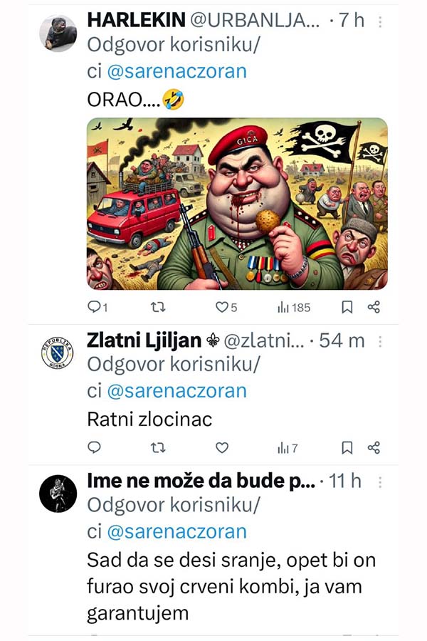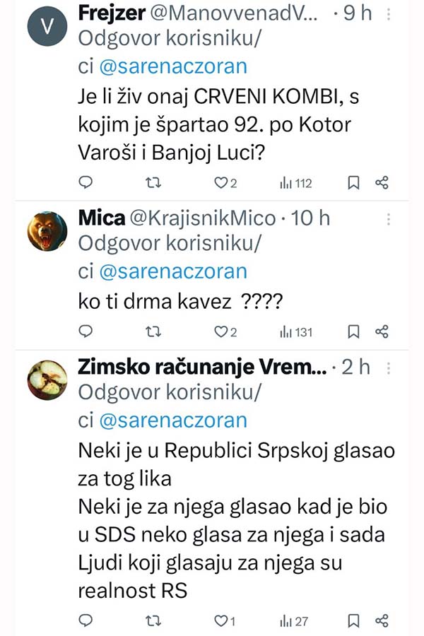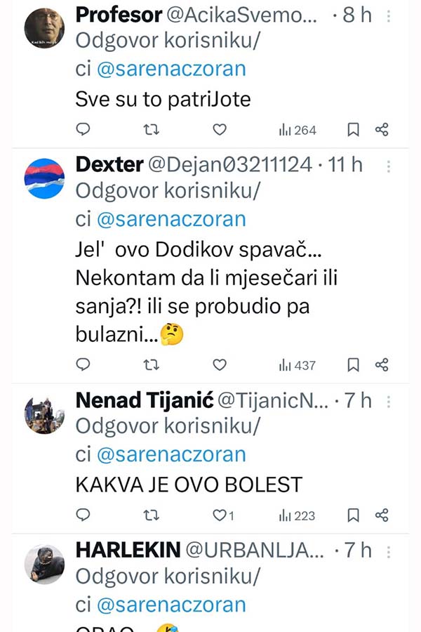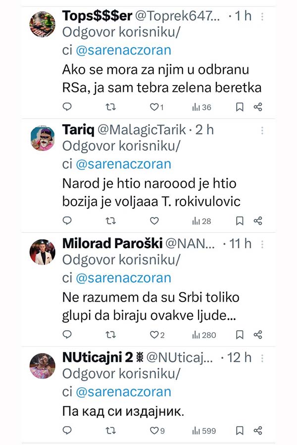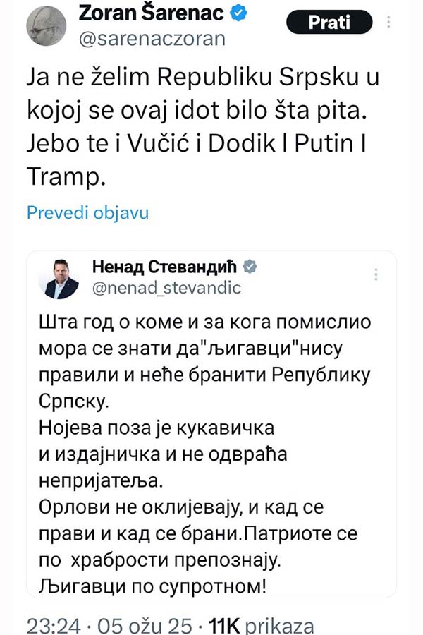 -Ja ne želim Republiku Srpsku u kojoj se ovaj idot bilo šta pita. Je*o te i Vučić i Dodik i Putin i Trump, poručio je na društvenim mrežama novinar Zoran Šarenac.