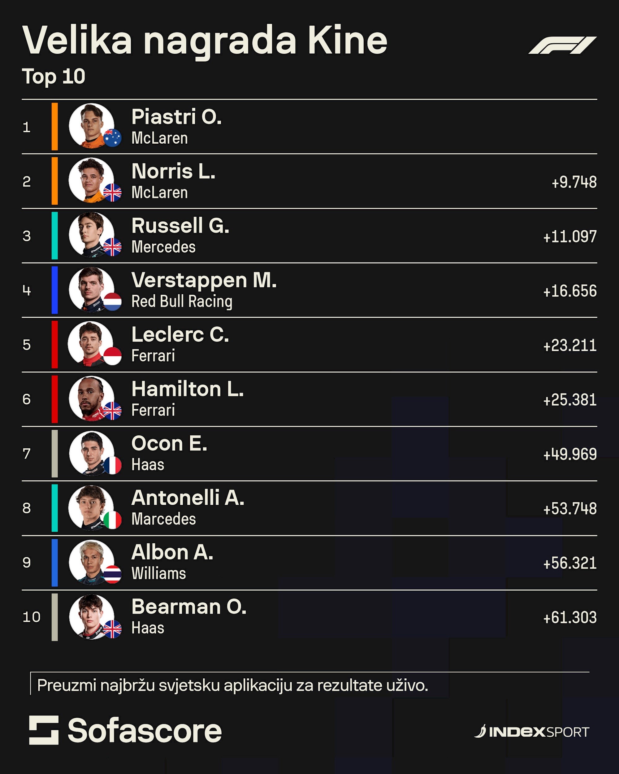 Oscar Piastri pobjednik je Velike nagrade Kine, druge utrke sezone Formule 1. Bila je to dominantna nedjelja za McLaren jer je odmah iza Piastrija završio i njegov momčadski kolega Lando Norris, dok je na trećem mjestu, baš kao i na prvoj utrci sezone, George Russell iz Mercedesa.