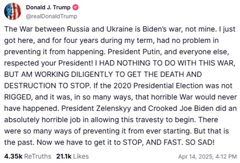 "Rat između Rusije i Ukrajine je Bidenov rat, ne moj. Ja sam tek stigao, i tijekom četiri godine mog mandata nije bilo problema u sprječavanju da se dogodi. Predsjednik Putin, i svi ostali, poštovali su vašeg predsjednika!