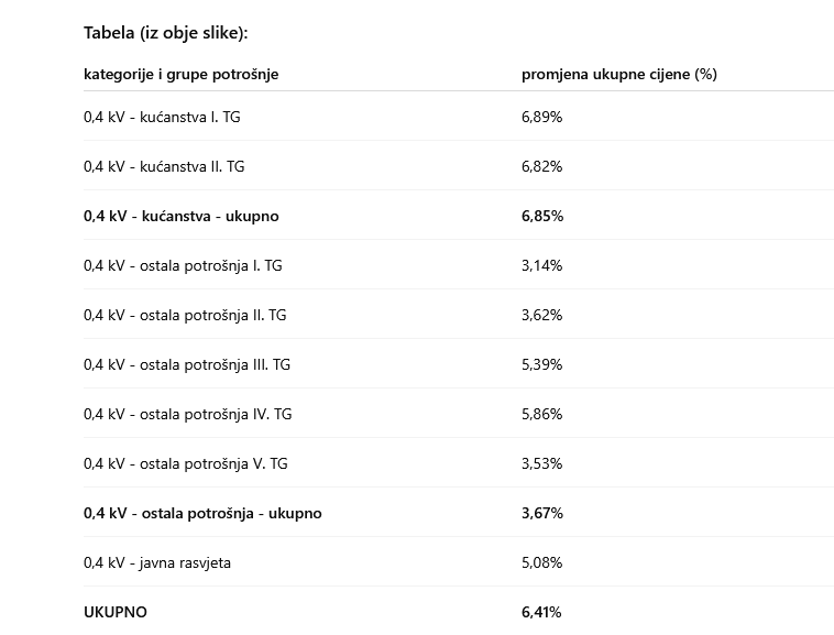 Prosječna promjena cijene opskrbe kod javnog opskrbljivača po kategorijama i grupama potrošnje iznosi: