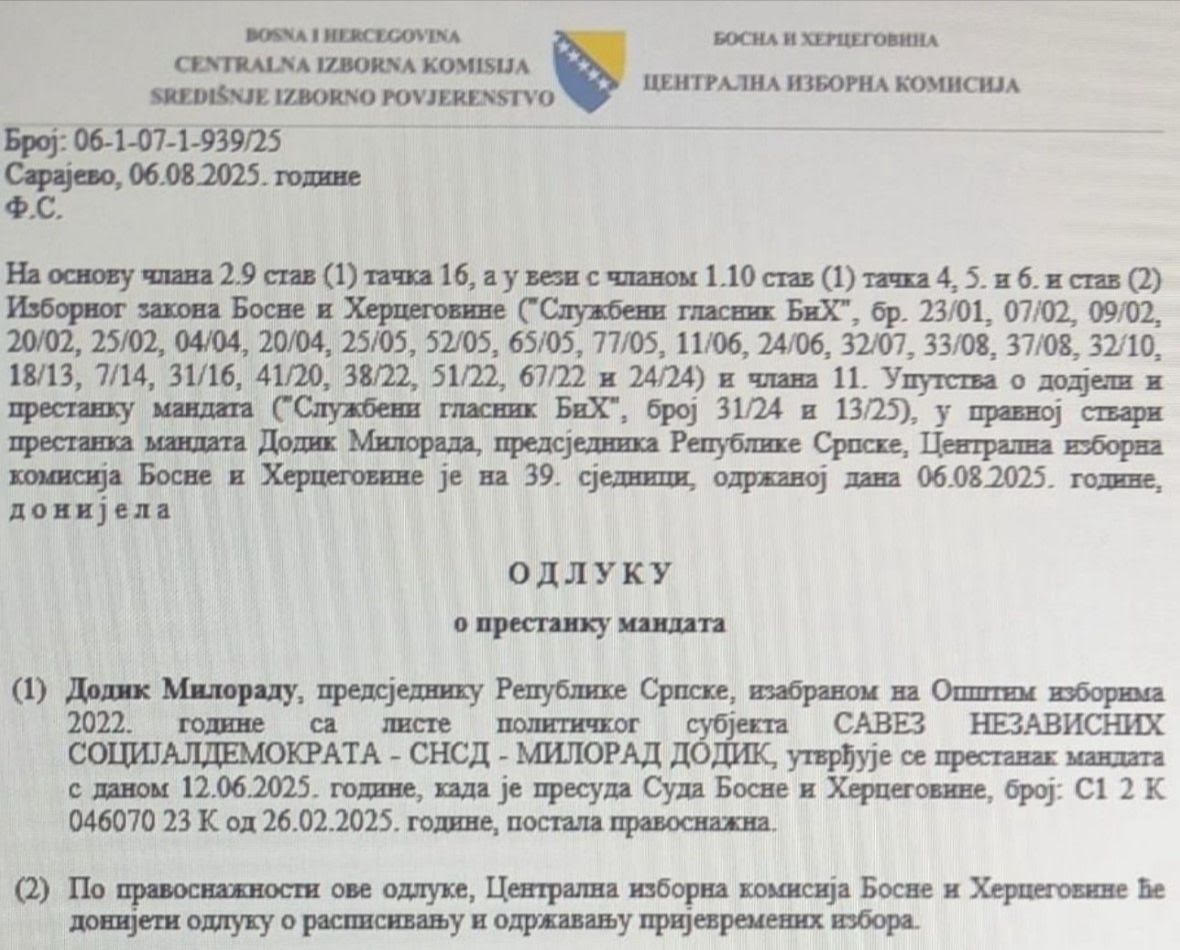 Kao što se može vidjeti sa javnosti predočene fotografije, nigdje u dispozitivu juče objavljene odluke CIK BiH nije napisao da Miloradu Dodiku prestaje mandat predsjednika Republike Srpske, već je napisano nešto što je neodređeno, da mu prestaje mandat. Koji mandat? Nigdje u dispozitivu odluke CIK nije napisao da Dodiku prestaje mandat predsjednika Republike Srpske.