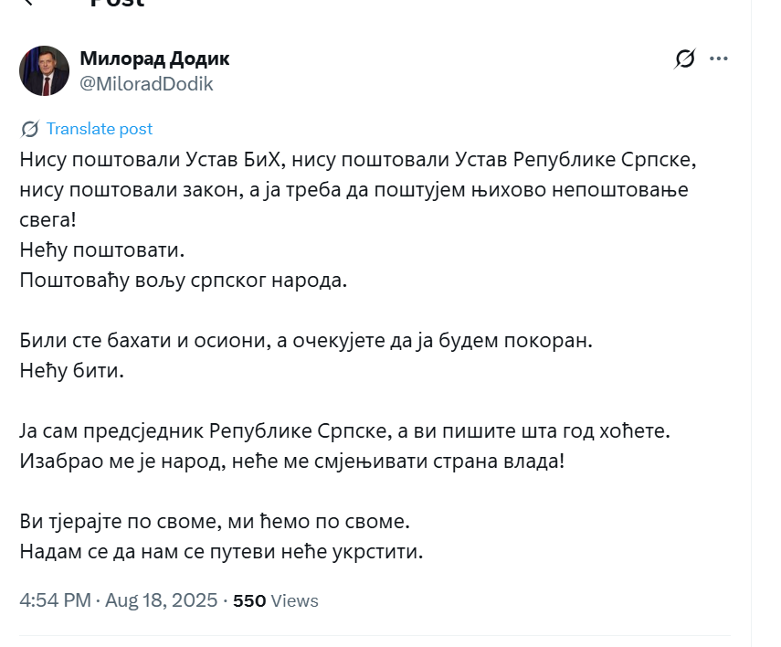 On je to komentirao u objavi na mreži X."Nisu poštovali Ustav BiH, nisu poštovali Ustav RS, nisu poštovali zakon, a ja treba da poštujem njihovo nepoštovanje svega!