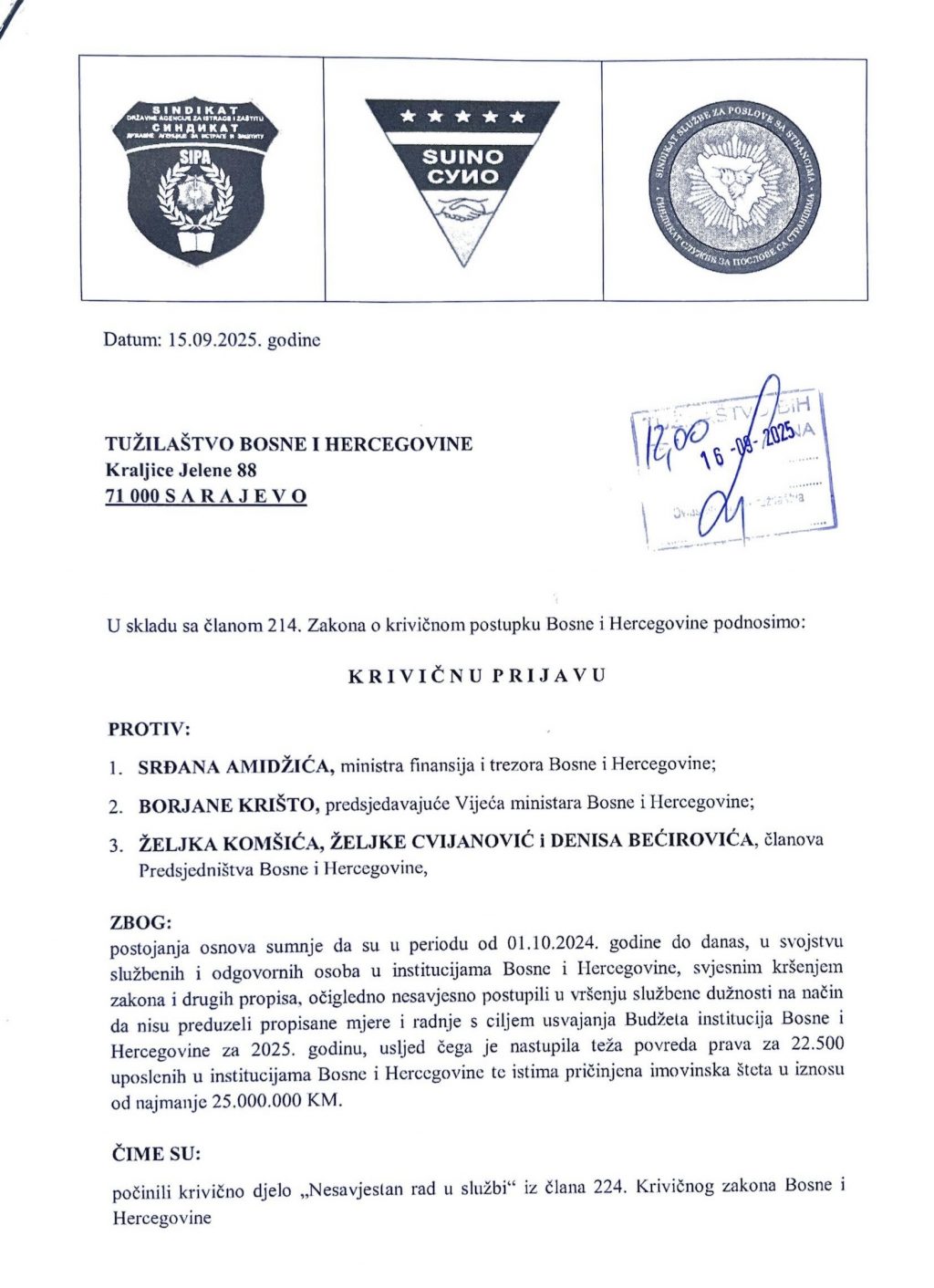 Sindikat Državne agencije za istrage i zaštitu (SIPA), Sindikat Službe za poslove sa strancima i Sindikat Uprave za indirektno oporezivanje Bosne i Hercegovine podnijeli su danas (16. septembar) krivične prijave Tužilaštvu BiH protiv najviših državnih zvaničnika zbog neusvajanja budžeta institucija BiH za 2025. godinu.