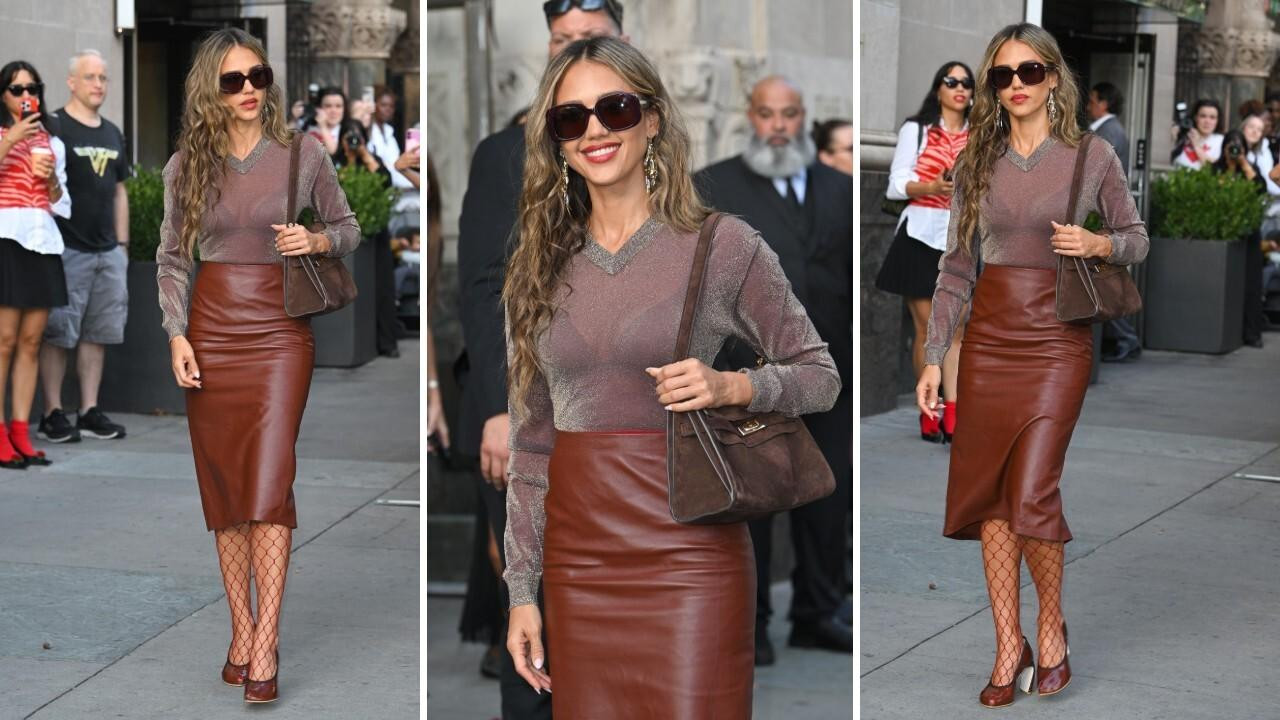 Blistala je u midi pencil suknji bordo boje i sjajnom džemperu kroz koji se jasno nazirao njezin grudnjak. Cijeli outfit upotpunila je velikom smeđom torbom, mrežastim crvenim čarapama i štiklama. Jessica Alba tako je bila savršen spoj klasične elegancije i modernih, smjelih detalja.