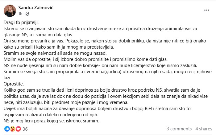 Sandra Zaimović, nekadašnja predsjednica Naše stranke Novi Grad Sarajevo i vijećnica ove stranke u Općinskom vijeću, kao i kandidatkinja Naše stranke za Skupštinu Kantona Sarajevo, objavila je status na svom Facebook profilu ne krijući razočarenje politikom Naše stranke.