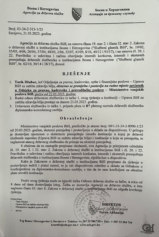 Rješenje o premještaju Tarika Džubura iz Uprave za zaštitu zdravlja bilja u MVP BiH