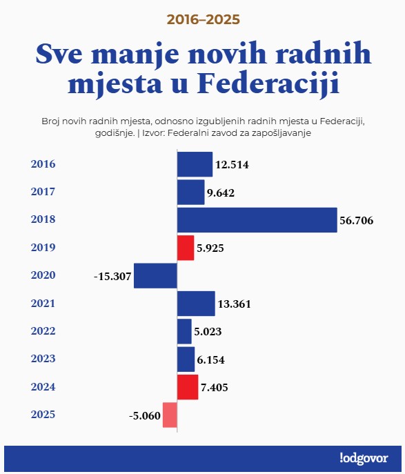 U Federaciji Bosne i Hercegovine ove godine izgubljeno je najmanje 10 hiljada radnih mjesta. Do te cifre dolazimo kada osim pada broja zaposlenih, uzmemo u obzir i prekid redovnog godišnjeg rasta zaposlenih u Federaciji, te broj radnih mjesta koja isključivo ovise o subvencijama, piše portal Odgovor.ba.