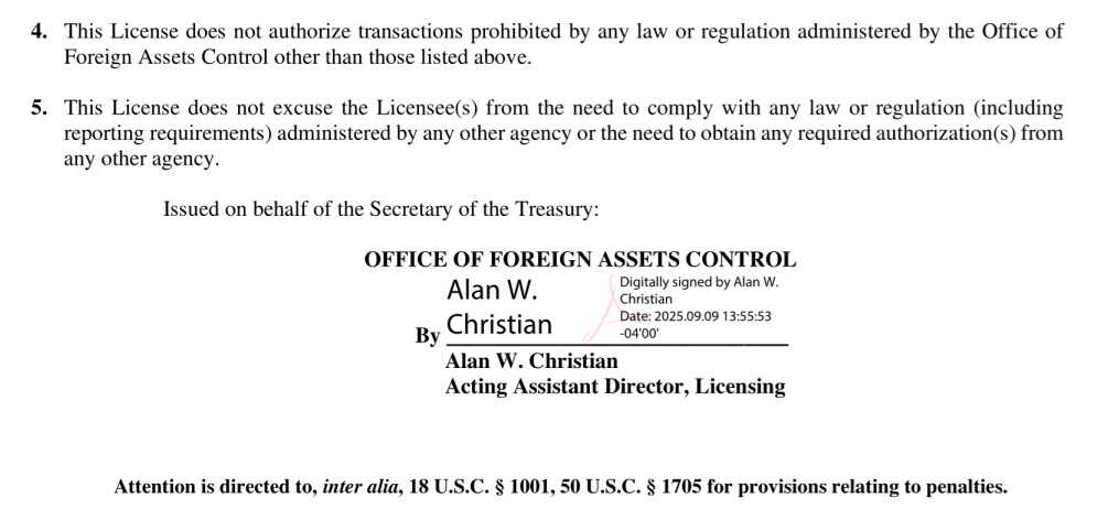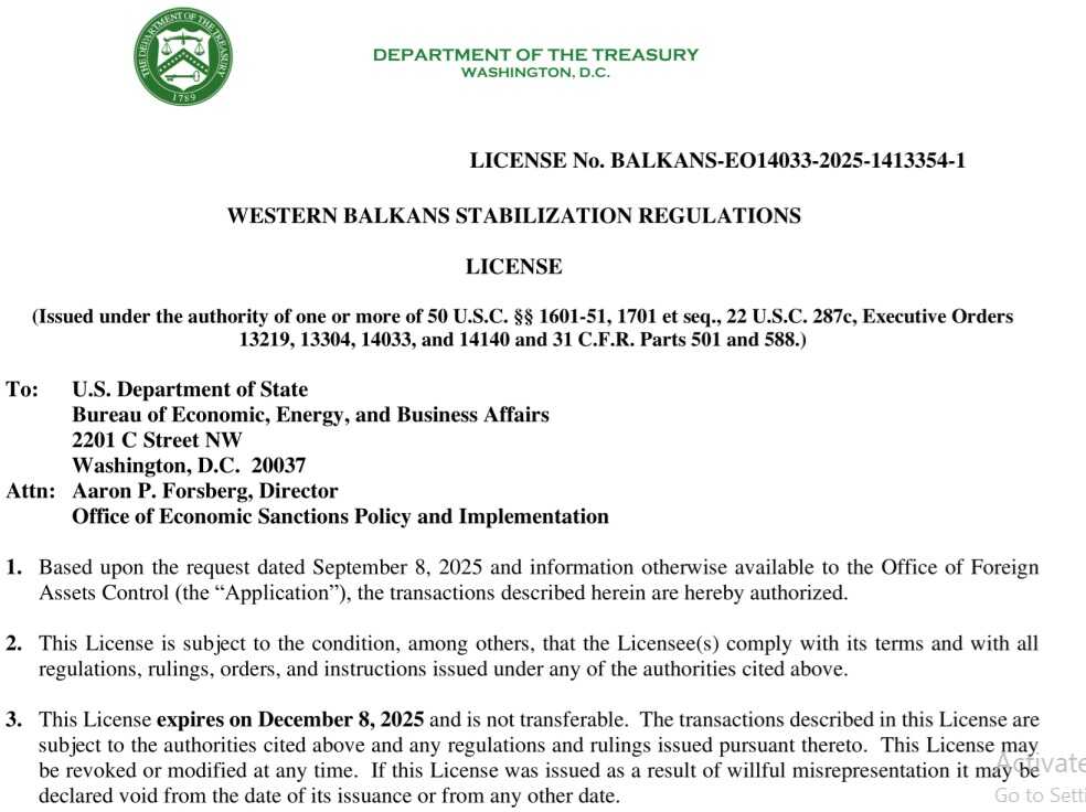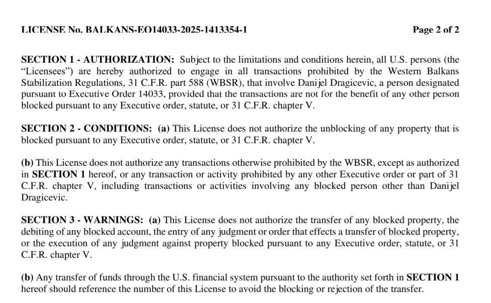 Licenca, izdata 9. septembra 2025. godine na zahtjev podnesen 8. septembra, odnosi se na regulacije iz seta propisa poznatih kao Western Balkans Stabilization Regulations (31 C.F.R. Part 588). Dokument, koji potpisuje Alan W. Christian, vršilac dužnosti pomoćnika direktora za licenciranje OFAC-a, omogućava američkim osobama da do 8. decembra 2025. godine obavljaju transakcije koje bi inače bile zabranjene sankcijama uvedenim protiv Dragičevića.