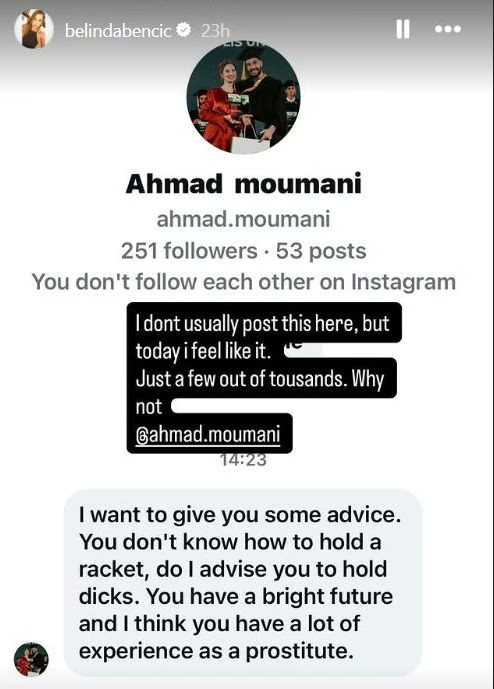 „Obično to ne radim, ali danas moram“, objavila je Benčić na svom Instagram profilu, prenosi švicarski Blick, pokazujući kakve poruke prima od pojedinih korisnika društvenih mreža.