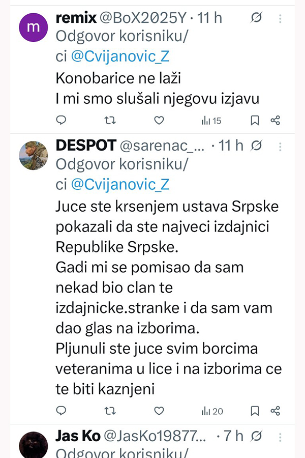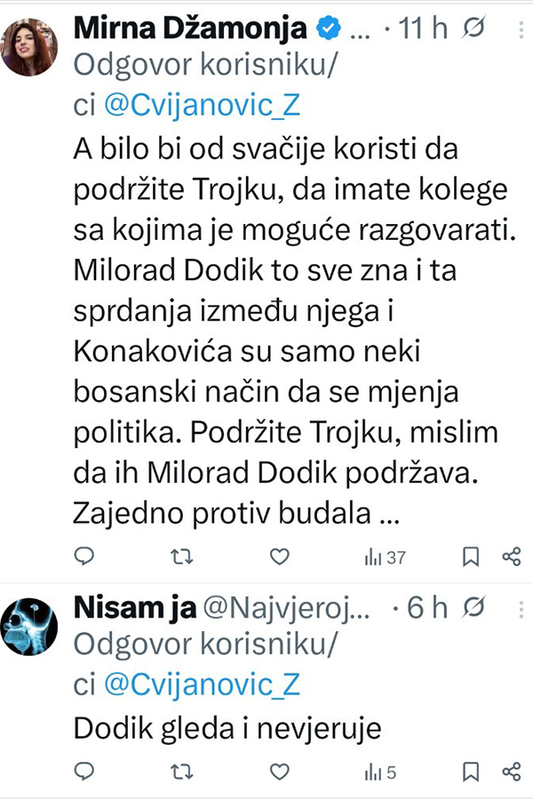 Uostalom, bespotrebno je da se ovakvim prijetećem izjavama dokazuje čak i svojim biračima, jer će Trojka svakako biti poražena na predstojećim izborima, poručila je Cvijanović.