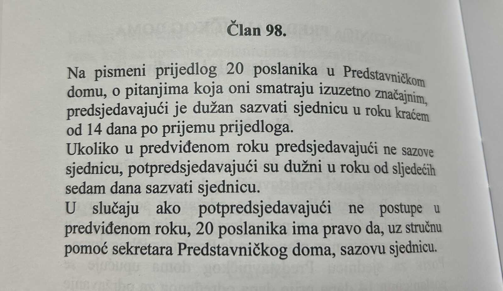 Navodi i da je član 98. Poslovnika o radu Predstavničkog doma Parlamenta F BiH jasan.