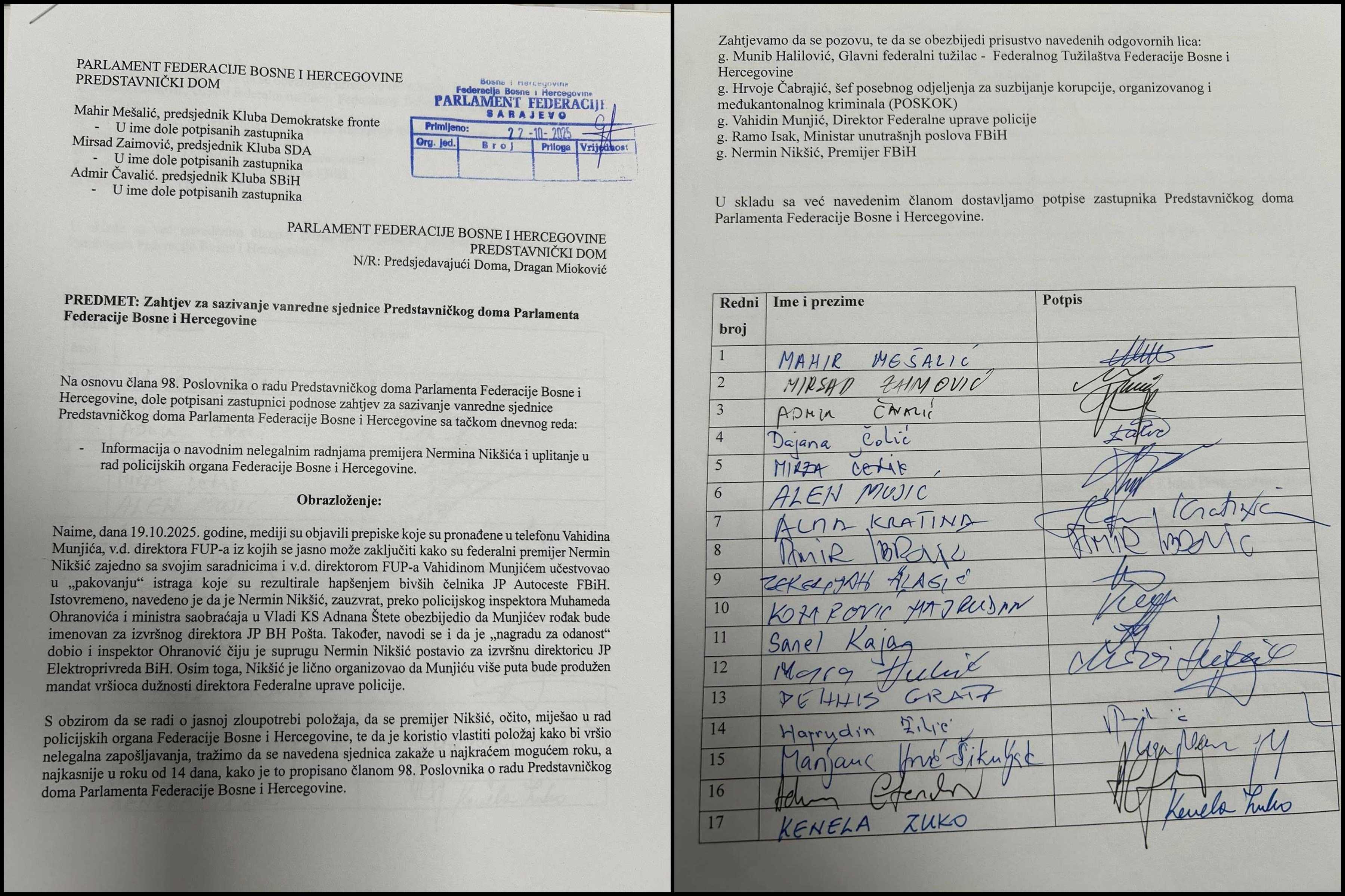 "Svih 13 zastupnika Kluba Demokratske fronte je dalo svoje potpise za sazivanje posebne sjednice Parlamenta entiteta FBiH.