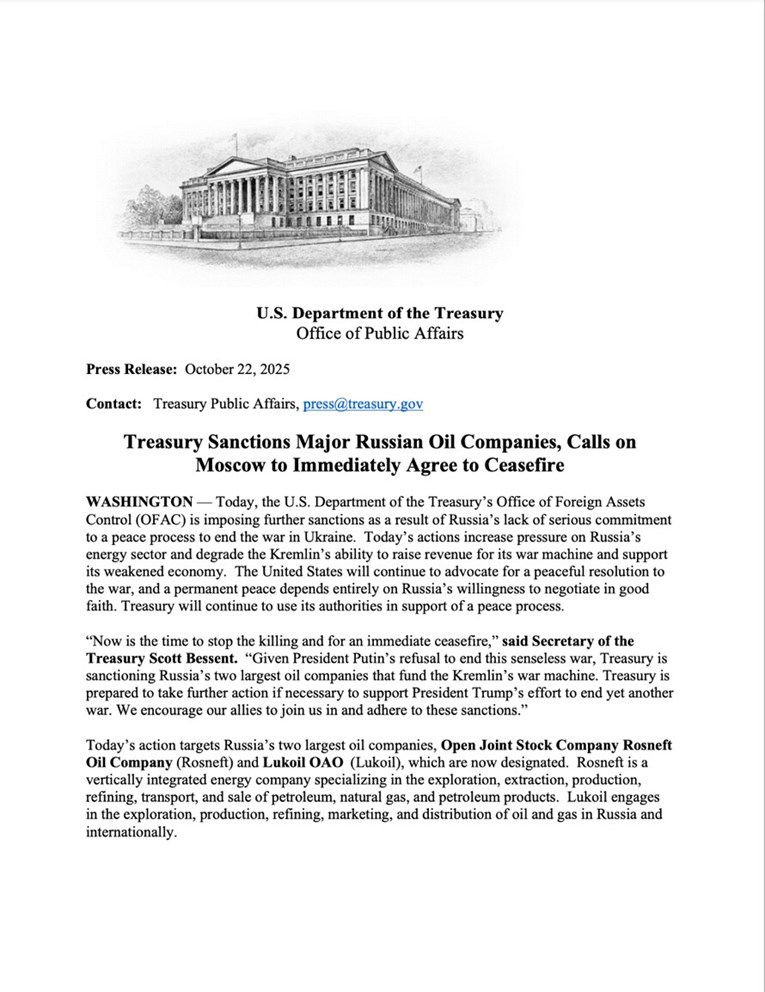 Američko ministarstvo finansija objavilo je nove, opsežne sankcije protiv dviju najvećih ruskih naftnih kompanija, Rosnjefta i Lukoila, u pokušaju da se izvrši dodatni pritisak na Moskvu da pristane na mirovne pregovore u Ukrajini.