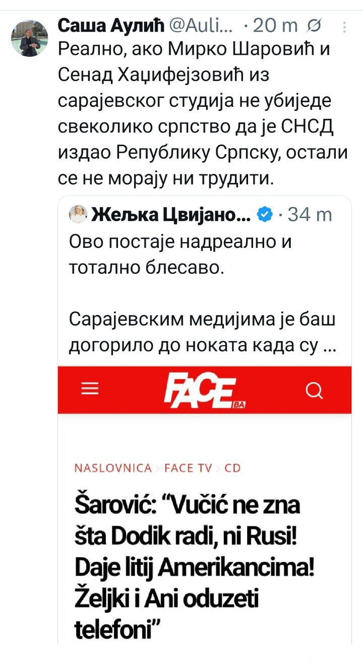 -Ovo postaje nadrealno i totalno blesavo. Sarajevskim medijima je baš dogorilo do nokata kada su upregnuli i Mirka Šarovića da priča utješne bajke tamošnjoj javnosti.