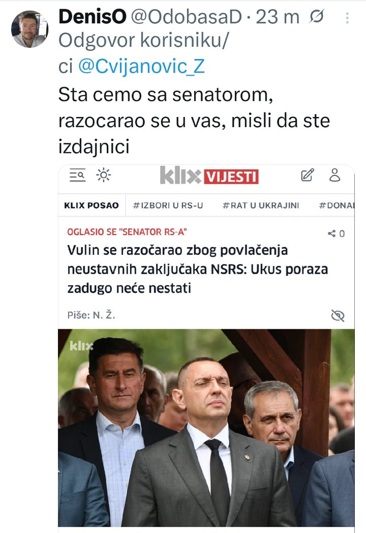 Podsjetimo, senator RS-a i bivši šef BIA-e Aleksandar Vulin kazao je da je duboko razočaran potezima vlasti u Banjoj Luci.