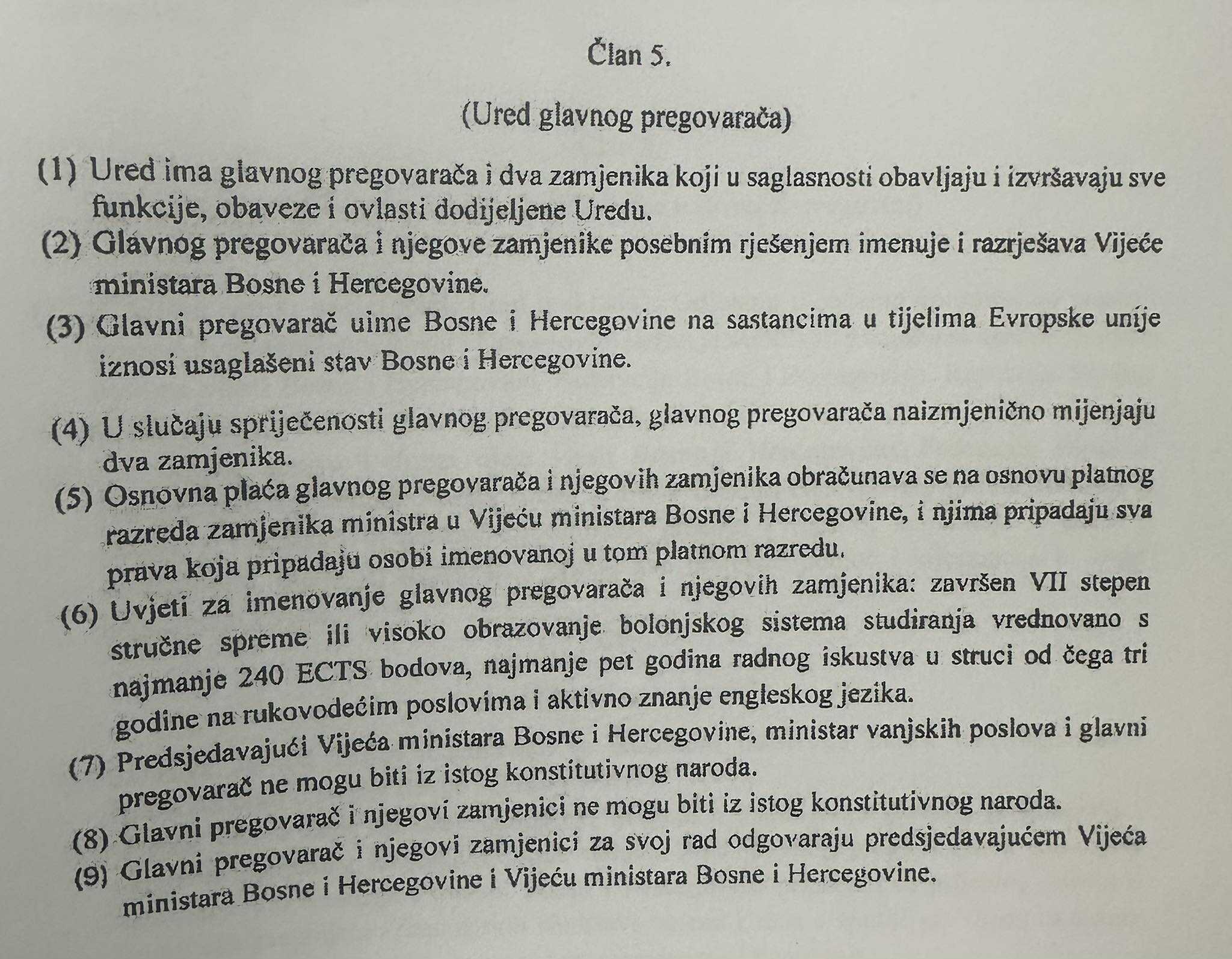 U članu 5. navedene odluke propisano je da „predsjedavajući Vijeća ministara Bosne i Hercegovine, ministar vanjskih poslova i glavni pregovarač ne mogu biti iz istog konstitutivnog naroda“