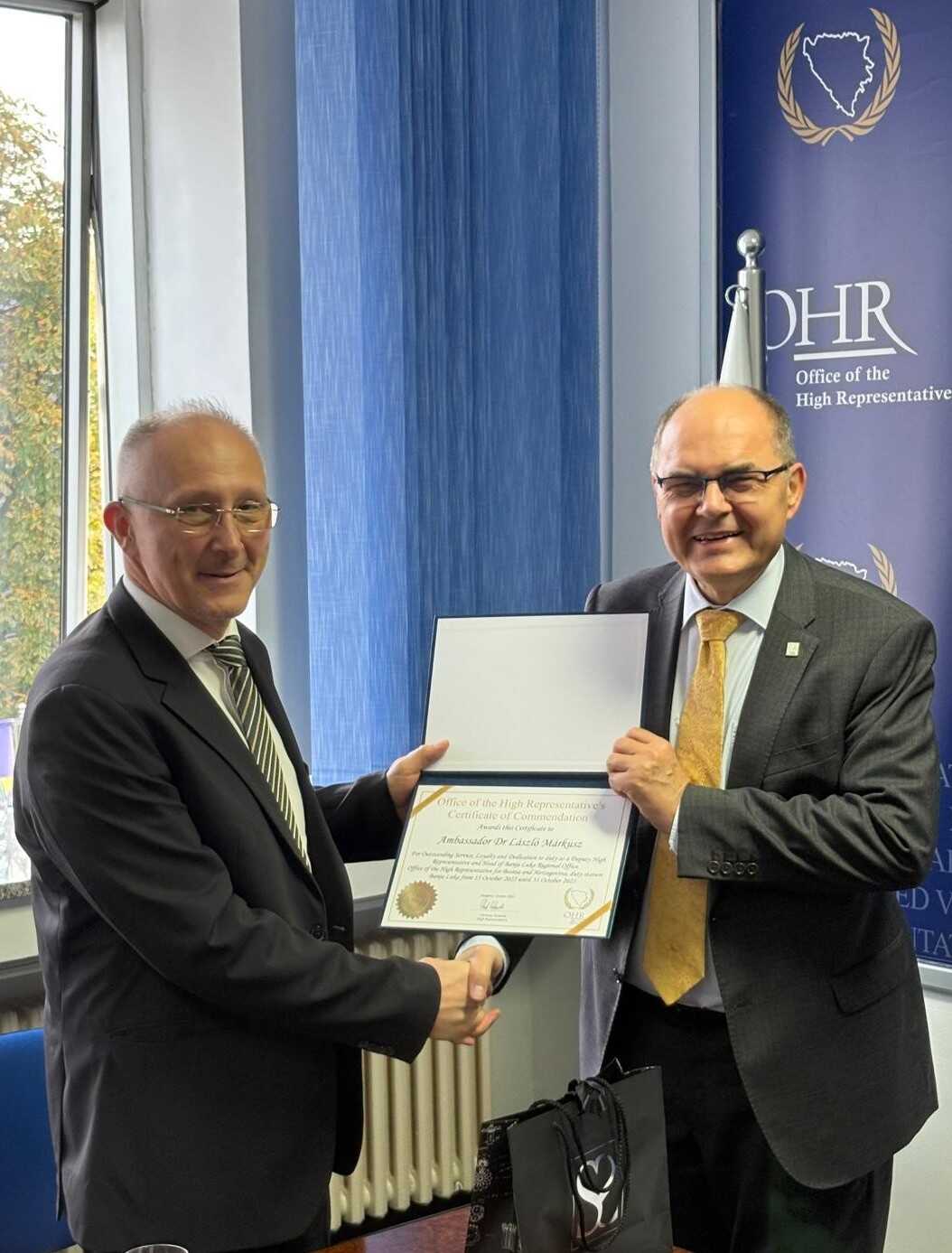 Visoki predstavnik Christian Schmidt posjetio je Kancelariju OHR-a u Banjoj Luci kako bi zahvalio ambasadoru Lászlóu Markusu na njegovoj predanoj službi, profesionalizmu i vrijednom doprinosu misiji OHR-a, kao i saradnji s partnerima u Rs tokom njegovog mandata na funkciji zamjenika visokog predstavnika i šefa banjalučke kancelarije.