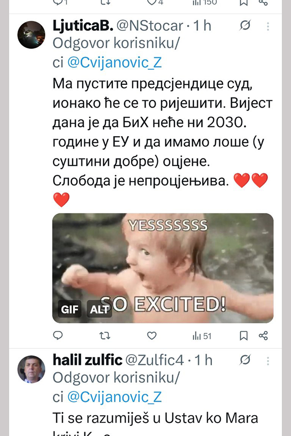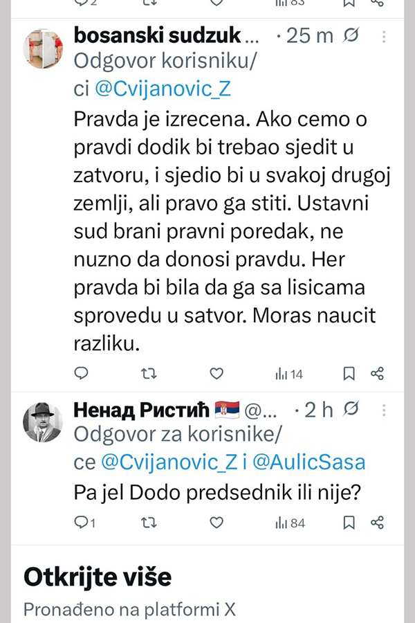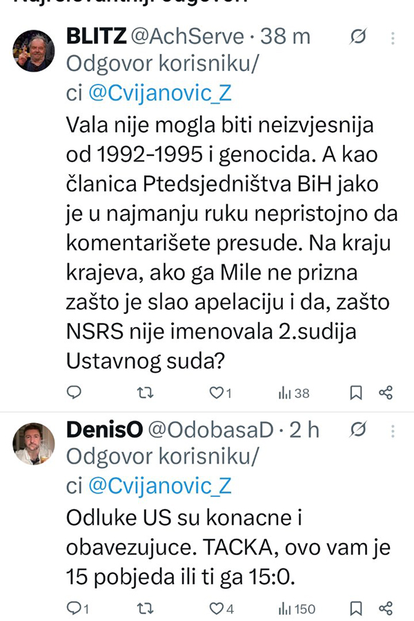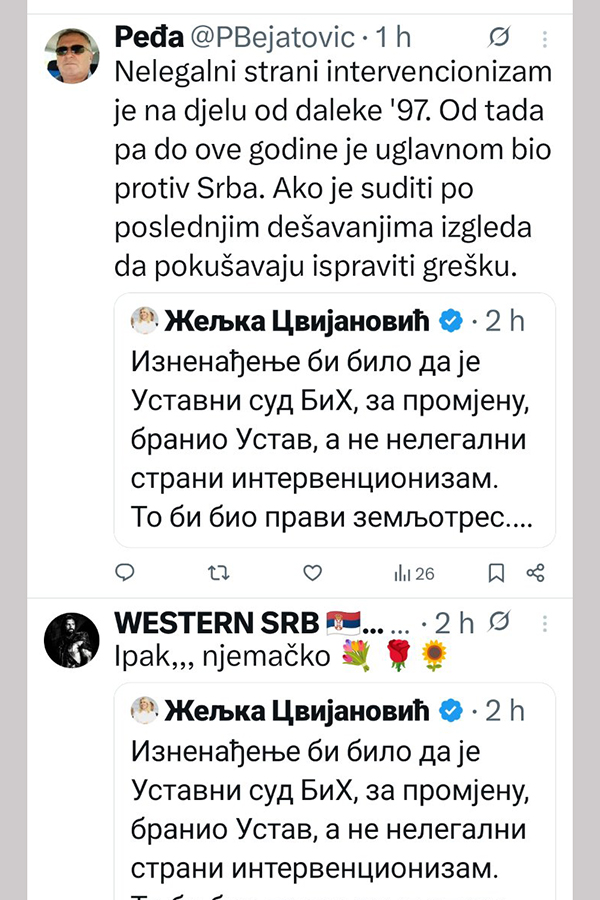 Ne stišavaju se reakcije na društvenim mrežama, nakon istupa Željke Cvijanović, članice Predsjedništva Bosne i Herceggovine.