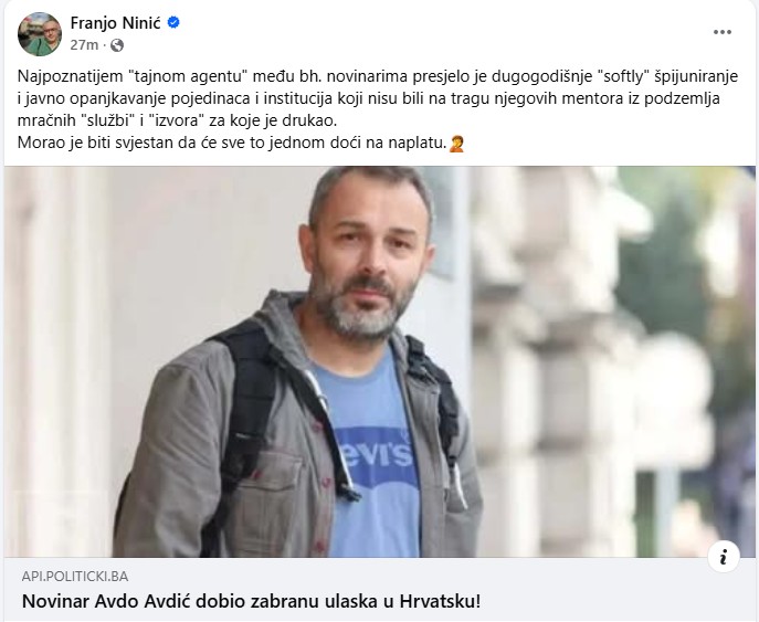 "Najpoznatijem 'tajnom agentu' među bh. novinarima presjelo je dugogodišnje 'softly' špijuniranje i javno opanjkavanje pojedinaca i institucija koji nisu bili na tragu njegovih mentora iz podzemlja mračnih 'službi' i 'izvora' za koje je drukao. Morao je biti svjestan da će sve to jednom doći na naplatu", napisao je Ninić.