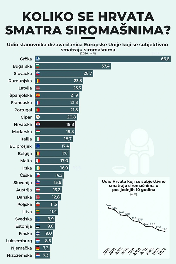 Najviše građana koji se osjećaju siromašnima ima Grčka (66,8 %), zatim Bugarska (37,4 %) i Slovačka (28,7 %).