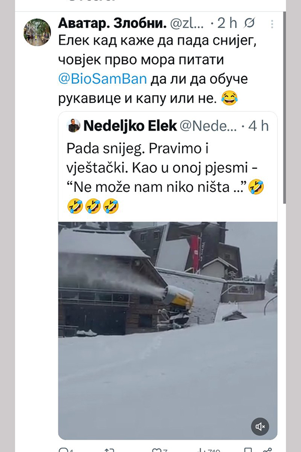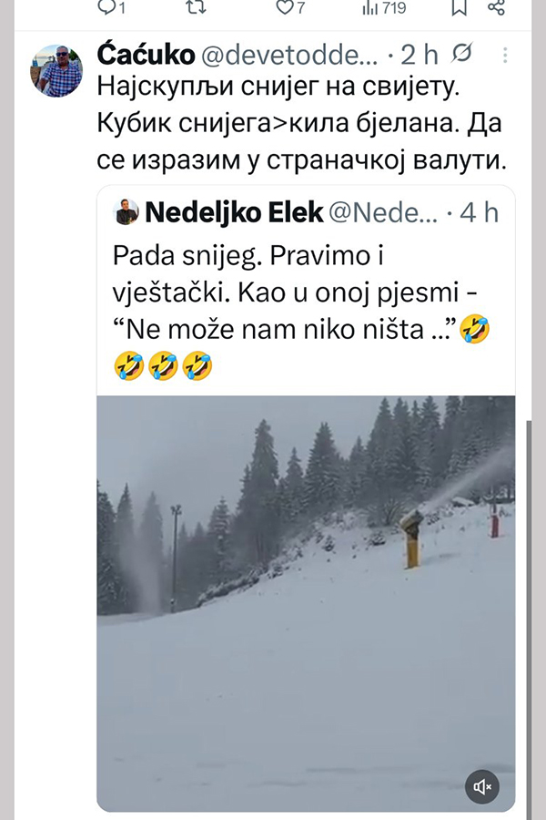 -Pada snijeg. Pravimo i vještački. Kao u onoj pjesmi - “Ne može nam niko ništa …”, poručio je Elek.