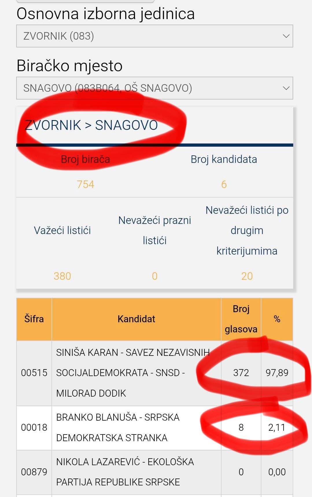 Slično je i na biračkom mjestu “Snagovo”, gdje je Karan dobio 372 glasa (97,89 posto), a Blanuša samo 8 glasova (2,11 posto).