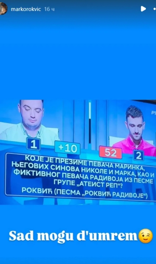 Sin legendarnog pjevača Marinka Rokvića, Marko Rokvić, oglasio se na Instagramu nakon što je završio u "Slagalici".