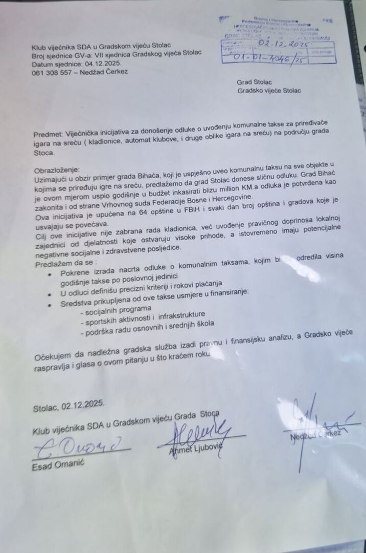 Klub vijećnika Stranke demokratske akcije (SDA) u Gradskom vijeću Stoca najavio je podnošenje inicijative za uvođenje posebne komunalne takse na objekte u kojima se priređuju igre na sreću, uključujući kladionice i automat klubove. O prijedlogu će se raspravljati na narednoj, sedmoj sjednici Gradskog vijeća, zakazanoj za 4. decembar 2025. godine.