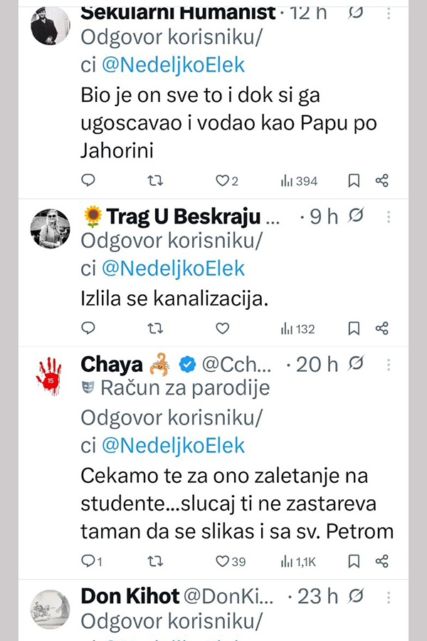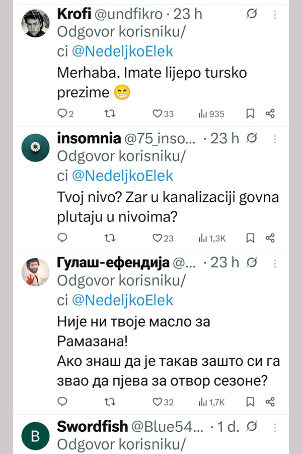- Svi mi kažu da nije moj nivo da komentarišem kokainskog i kockarskog ovisnika, i čovjeka koga su više vozili u gepeku, nego na sjedištu, i nije. Staviću samo ove slike i da svako treba da ostane u svom društvu i na svom nivou, poručio je Elek.