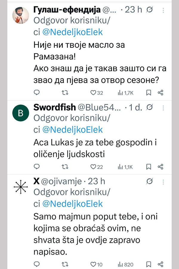 Nedeljko Elek poslao je poruku srbijanskom pjevaču Aci Lukasu, nakon čega su uslijedile brojne reakcije.