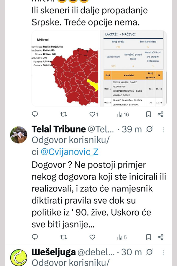- Ili dijalog ili daljnji pad BiH. Treće opcije nema. Poruke iz administracije predsjednika Trumpa su ohrabrujuće da budućnost BiH treba graditi na dogovoru predstavnika triju konstitutivnih naroda. Republika Srpska se s tim u potpunosti slaže, poručila je na društvenim mrežama Željka Cvijanović, član Predsjedništva BiH.