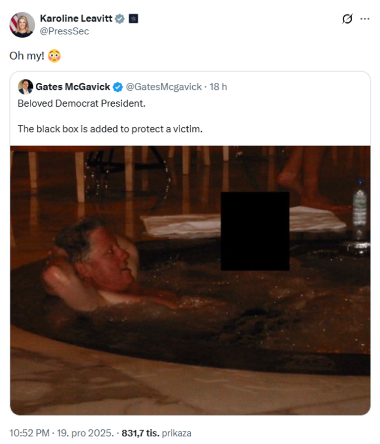 Objavu je brzo iskoristila Bijela kuća. Tajnica za medije Karoline Leavitt podijelila je sliku Clintona iz bazena na X-u uz komentar "O, Bože!".