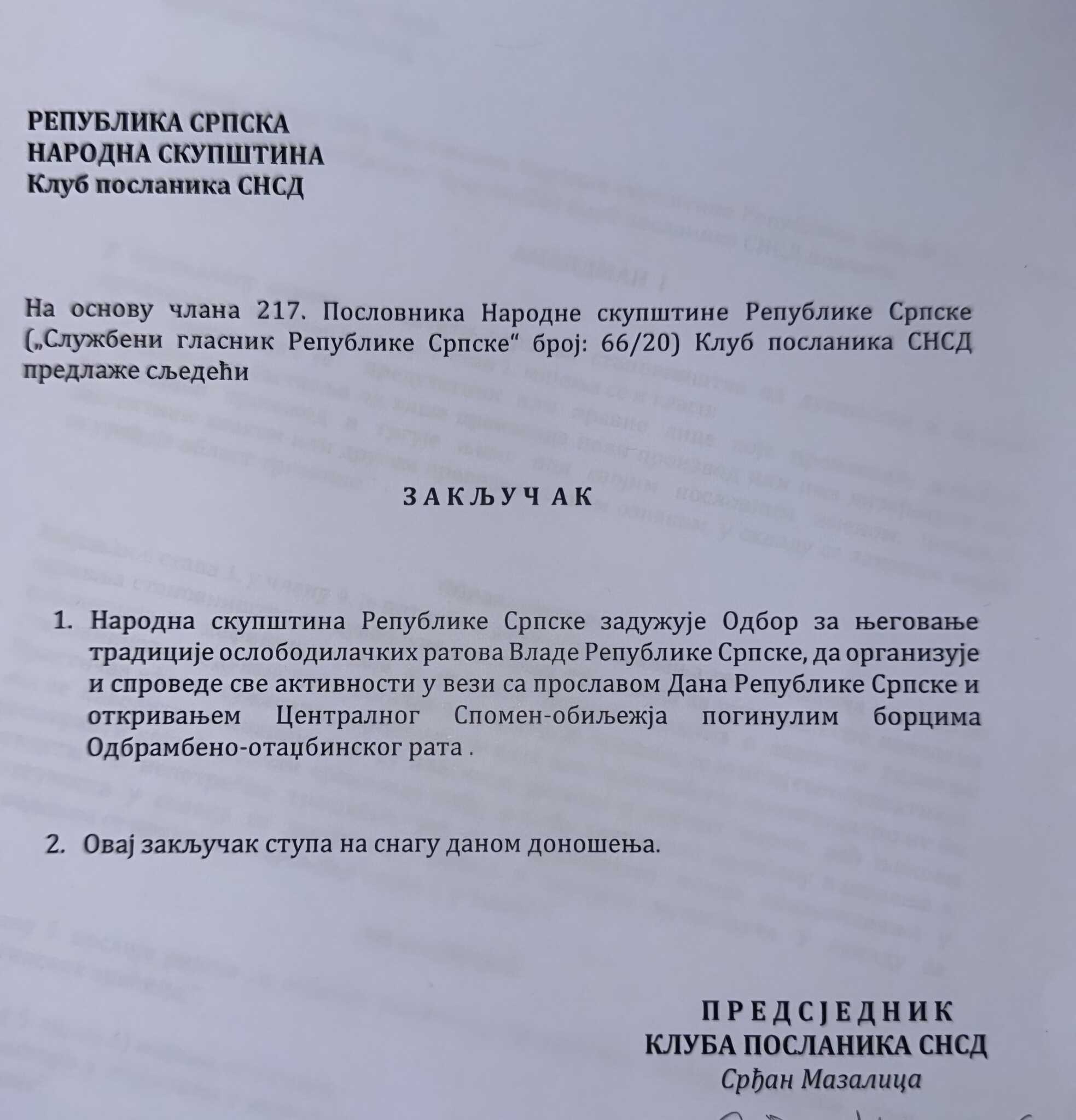 Zbog, kako navodi, potpunog izostanka adekvatne reakcije Tužilaštva Bosne i Hercegovine po ranije podnesenim krivičnim prijavama, Narodna skupština Rs nastavlja s neustavnim djelovanjem i javno poziva i druge institucije i organizacije da se uključe u obilježavanje 9. januara kao dana entiteta Rs.