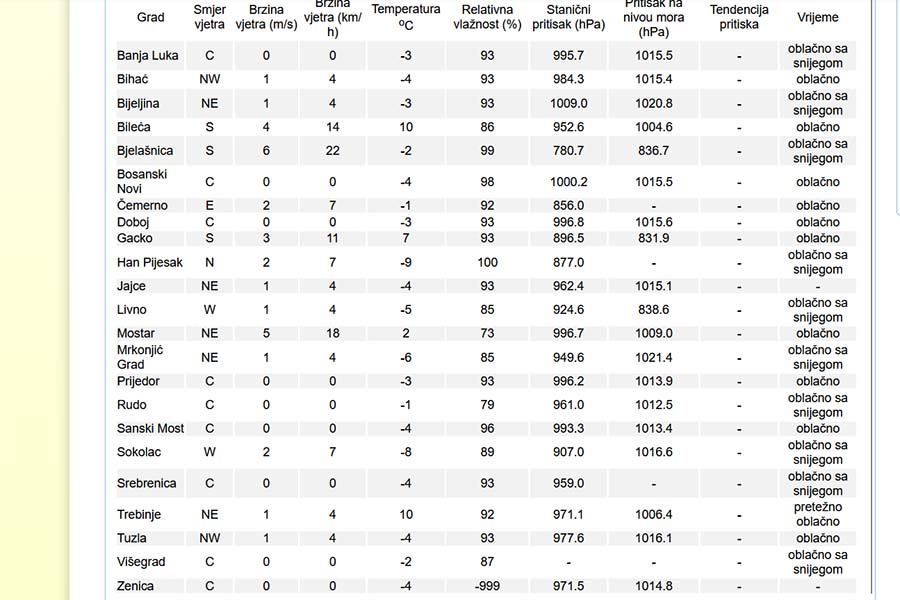 Danas se u našoj zemlji očekuje oblačno vrijeme sa kišom u Hercegovini i snijegom u Bosni. Poslije podne i tokom noći snijeg je moguć i u sjevernim područjima Hercegovine. Visina novog snježnog pokrivača u istočnim i dijelovima centralne Bosne, uglavnom, između 10 i 20, na planinama do 40 cm. Vjetar slab do umjeren sjeverni i sjeveroistočni. Jutarnja temperatura zraka od -8 do -2, na jugu od 2 do 7, a dnevna od -6 do 0, na jugu od 4 do 10 °C.