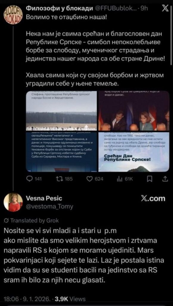 Nalog blokadera sa Filozovskog fakulteta u Beogradu , pokrenuo je potpuni haos na društvenoj mreži Iks (X) i posvađao one koji su, po svemu sudeći, do juče bili uz njih – a sve je krenulo od njihove čestitke za Dan Republike Srpske što se protivnicima aktuelne vlasti nije svidjelo.