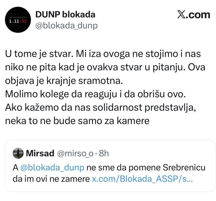 “Mi iza ovoga ne stojimo i nas niko ne pita kada je ovakva stvar u pitanju. Ova objava je krajnje sramotna. Molimo kolege da reaguju i obrišu ovo. Ako kažemo da nas solidarnost predstavljam neka to ne bude samo za kamere”, poručio je nalog DUNP blokada kolegama sa Filozofskog, koji ih nisu poslušali pa objava i dalje stoji.